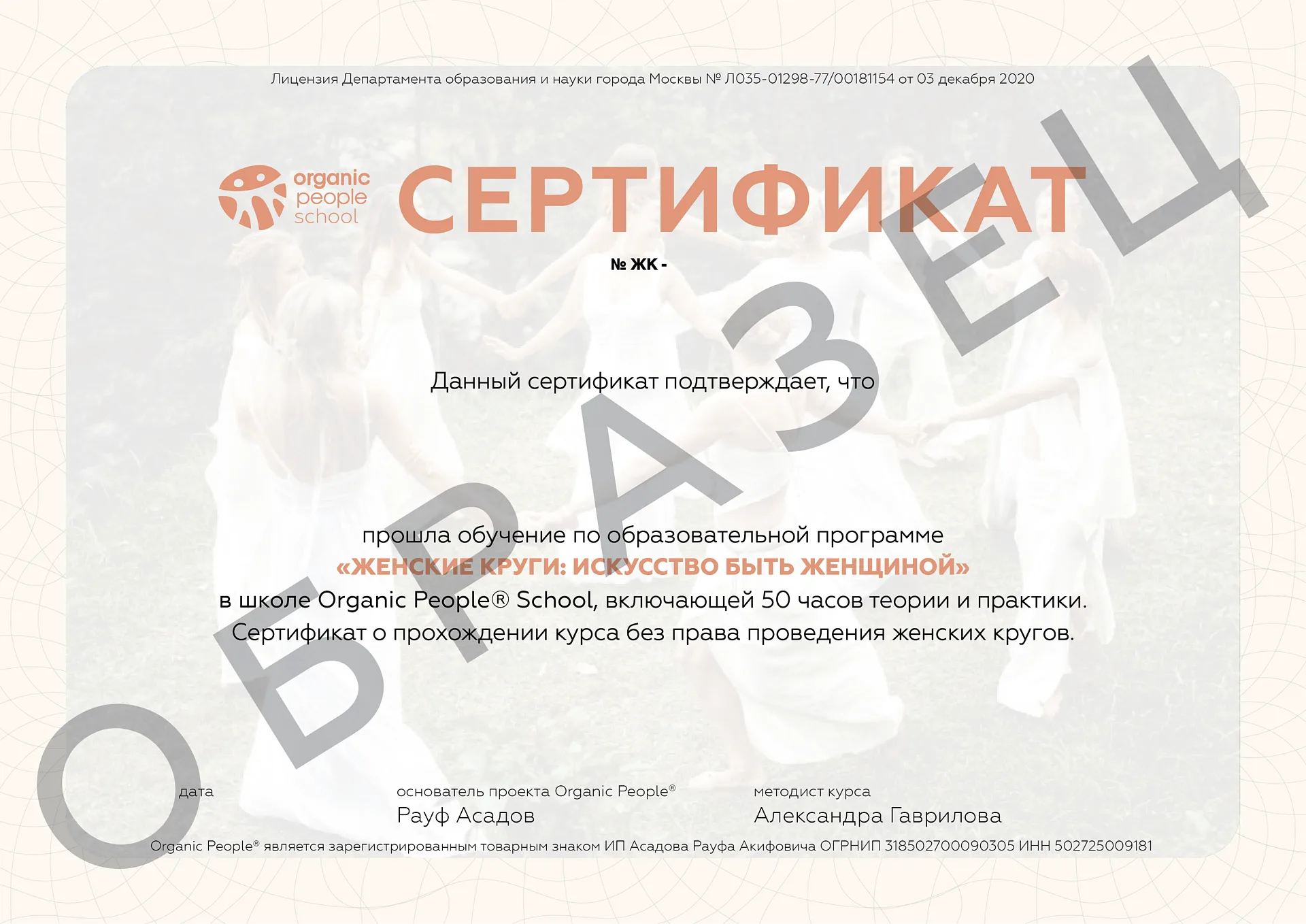 ▸ сертификат установленного образца на русском языке о прохождении данного курса без права проведения женских кругов всем, кто полностью прошёл обучение, но не сдал экзамен.